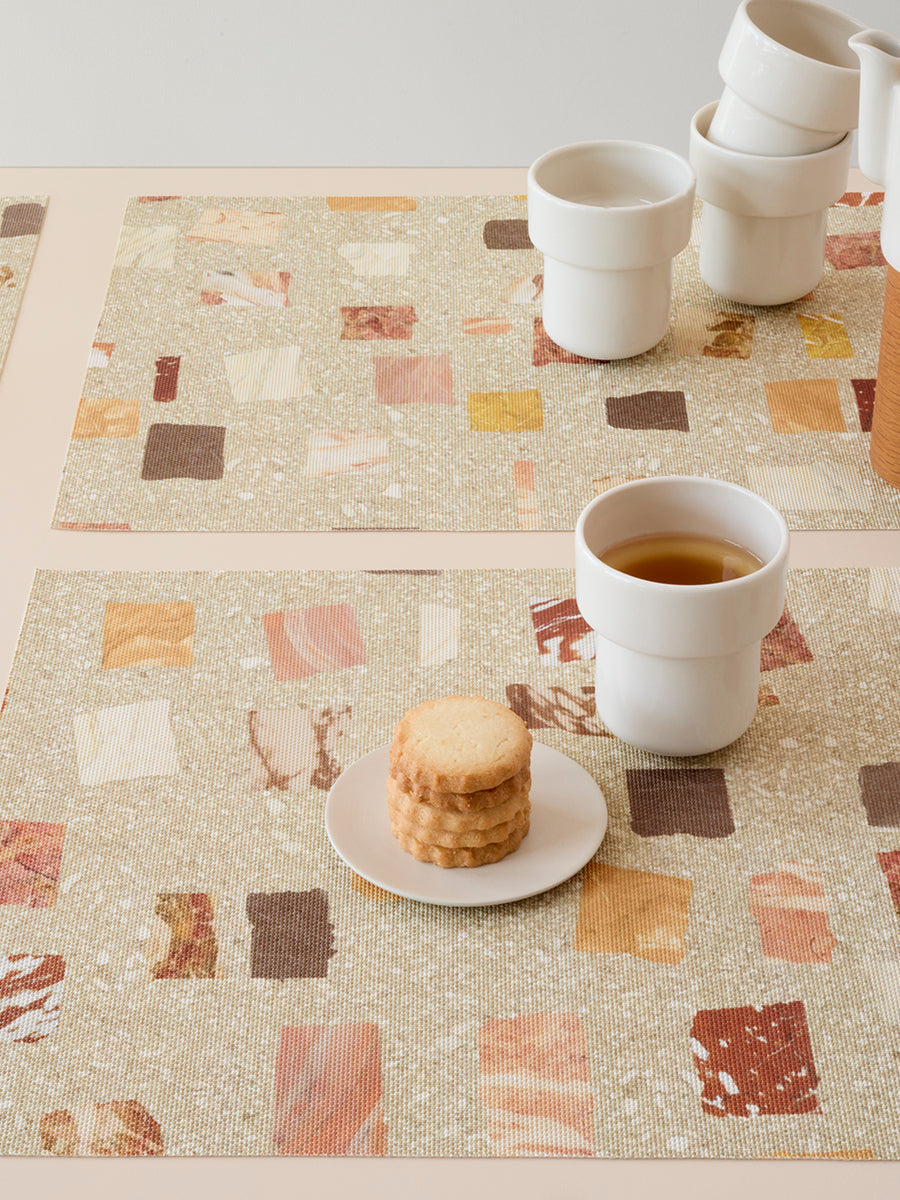 Inspiré du terrazzo, le set de table Pietra revisite ce matériau iconique à travers un design graphique et contemporain. Son motif imprimé, composé de formes multicolores évoquant le marbre, le granit et le quartz, apporte une touche décorative élégante à toutes les tables.